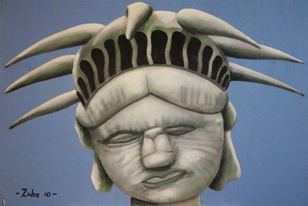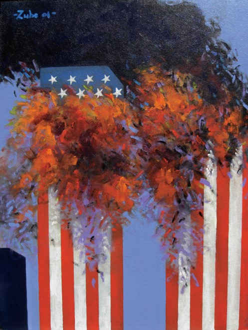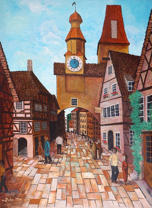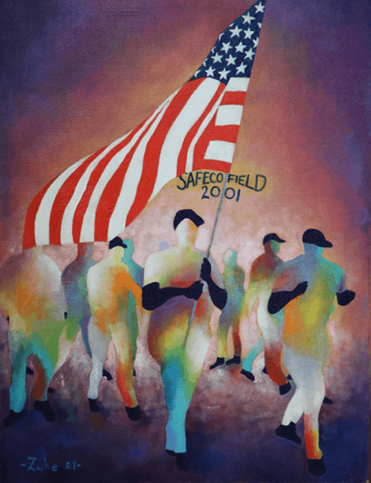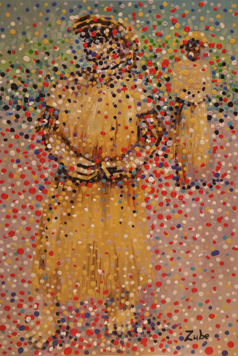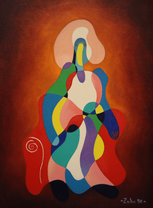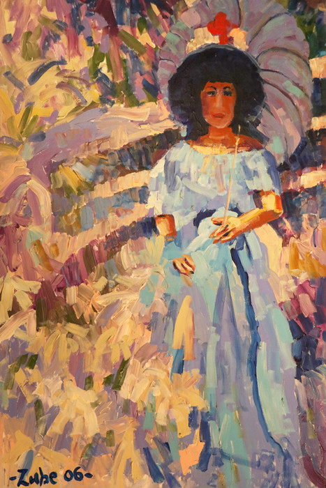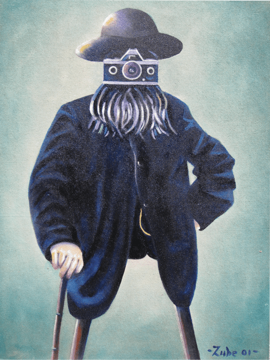 Claude Monet is presented here as a crusty old camera, mounted on a tripod. The painting affirms my belief that 1) Surrealism can exist in any painting of any era, and 2) the invention of the camera triggered the era of Modern Art. The camera is the perfect precedent for the Impressionists' belief that an artist should respond to one's first impression. This is exactly what the camera does.