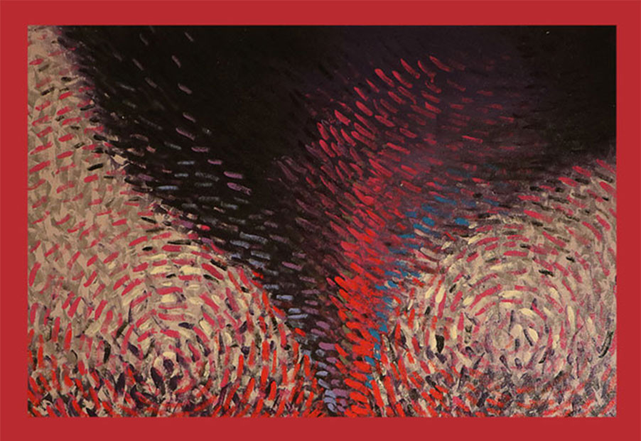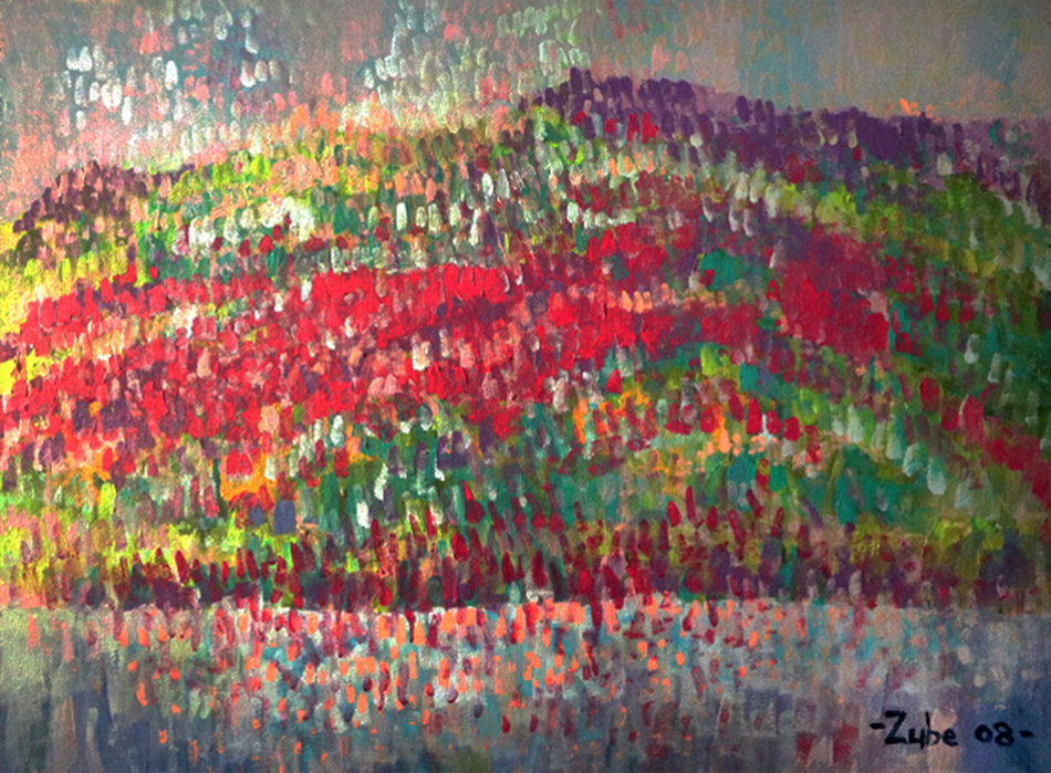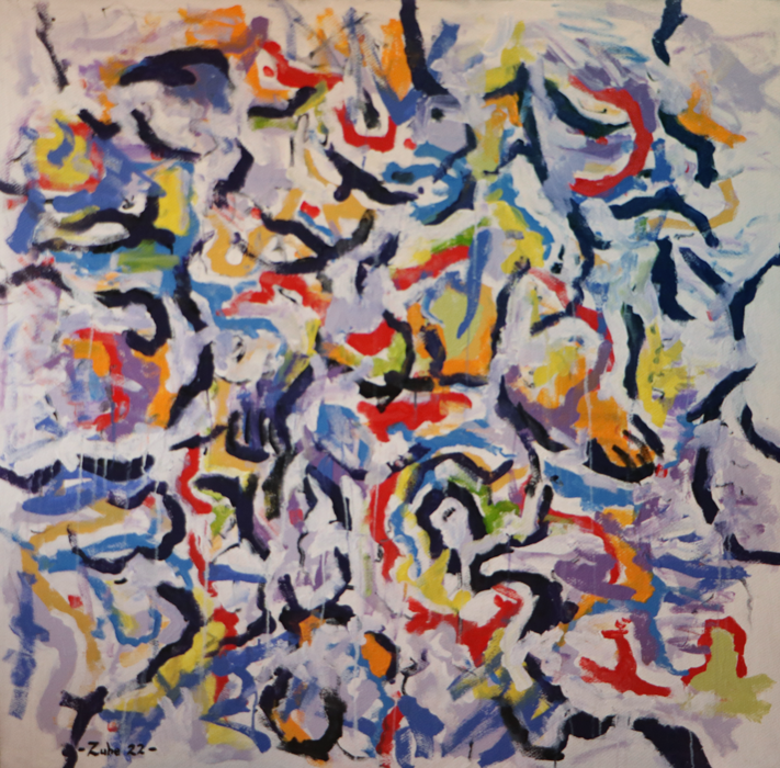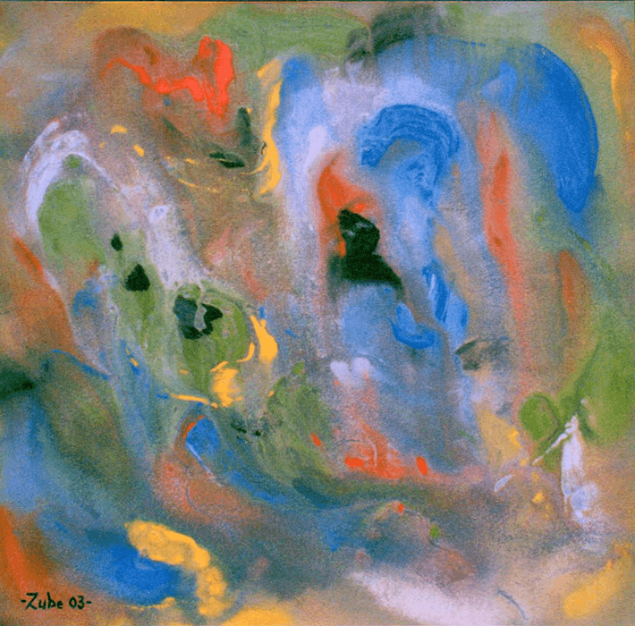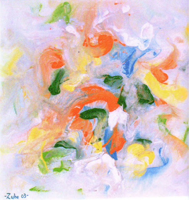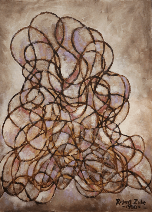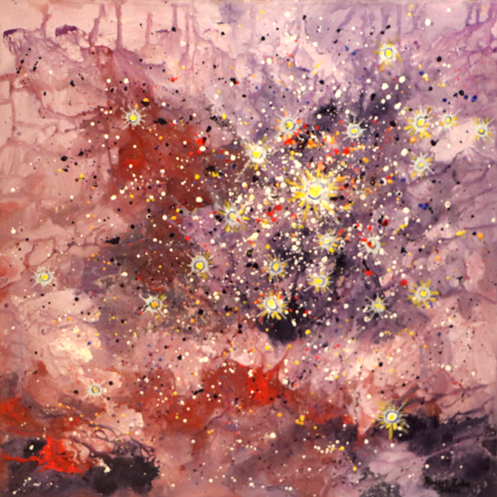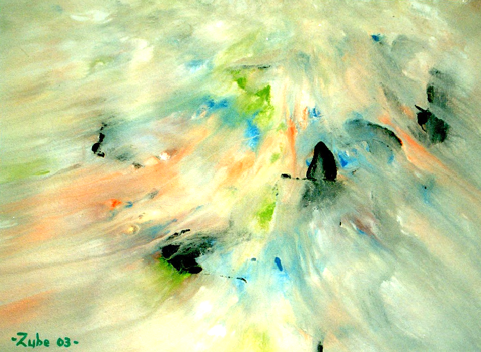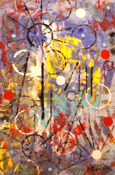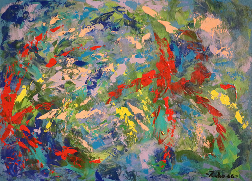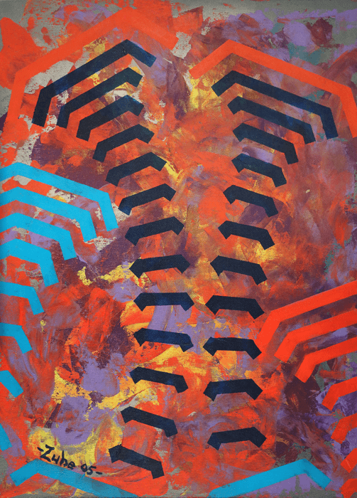 The methodology is not revealed by the linear fragmented lines of the composition. The secret lies in the spaces between the lines. It is here where the distinction between positive and negative space is severed, allowing color to flow freely back and forth between all areas of the painting.