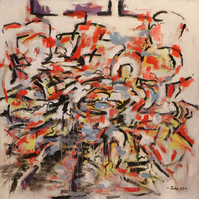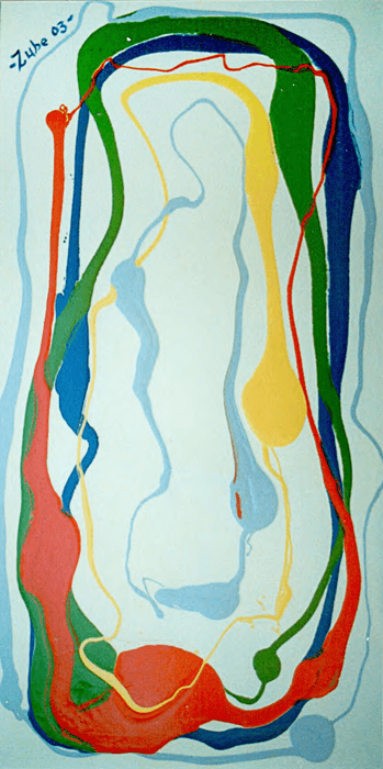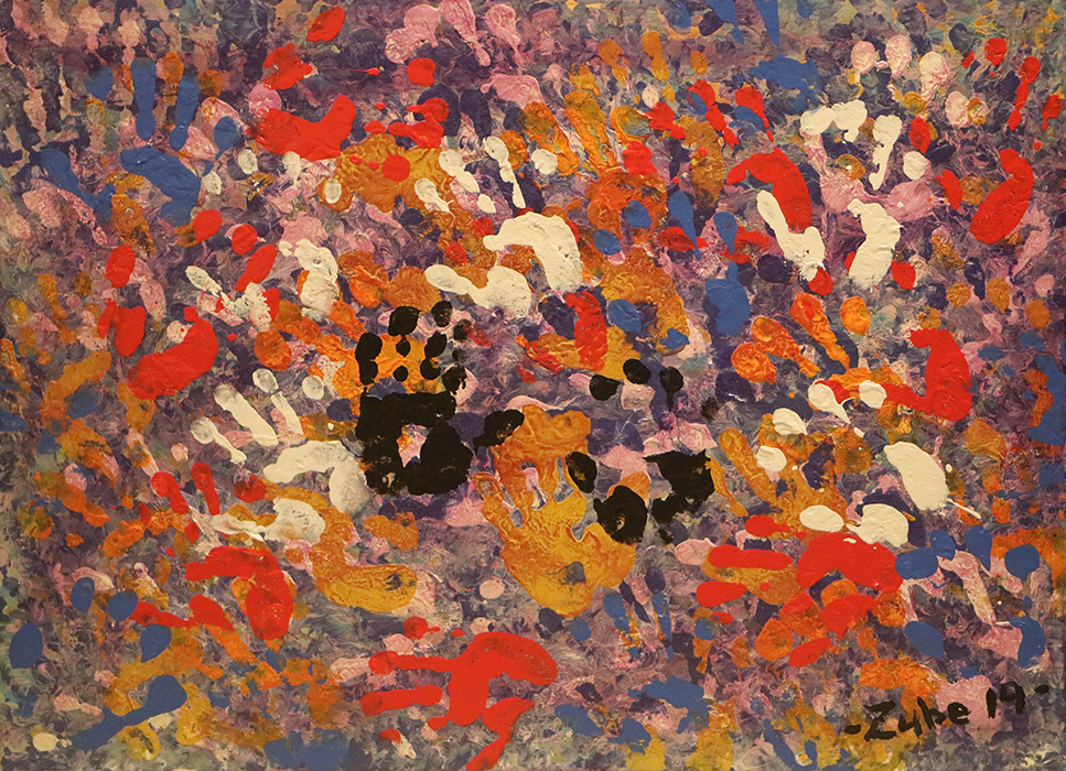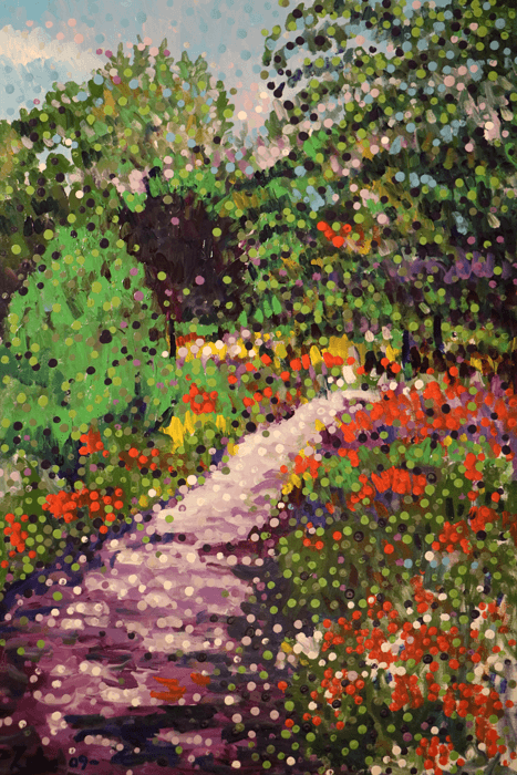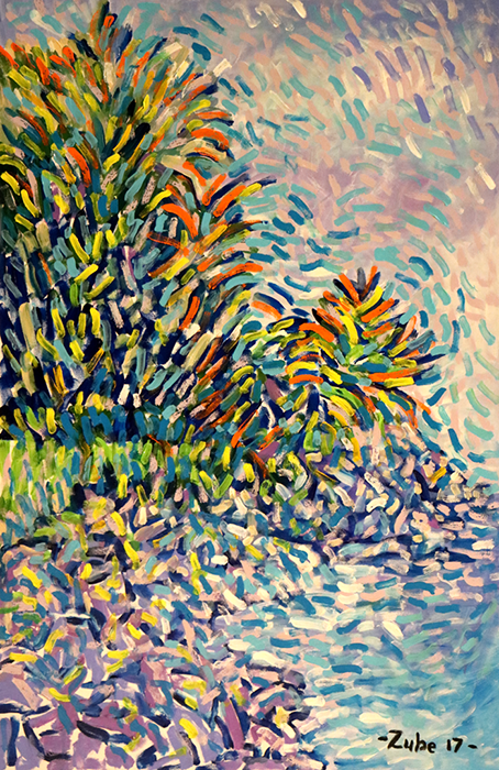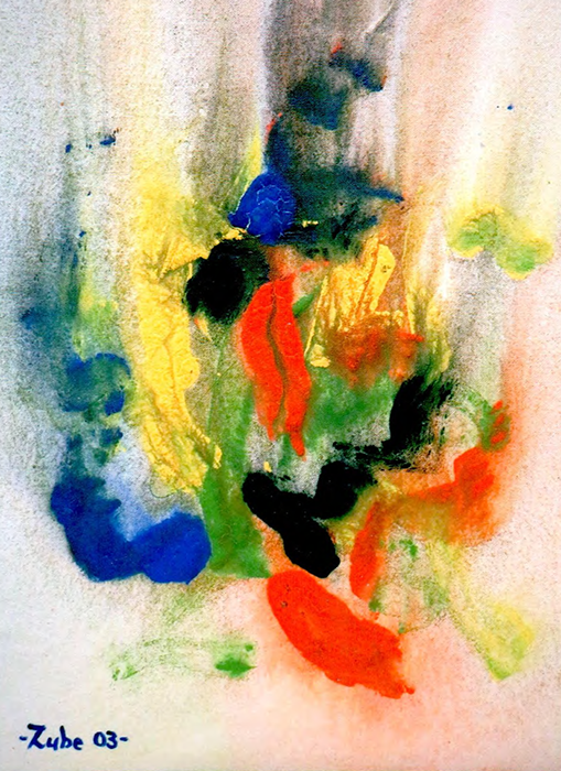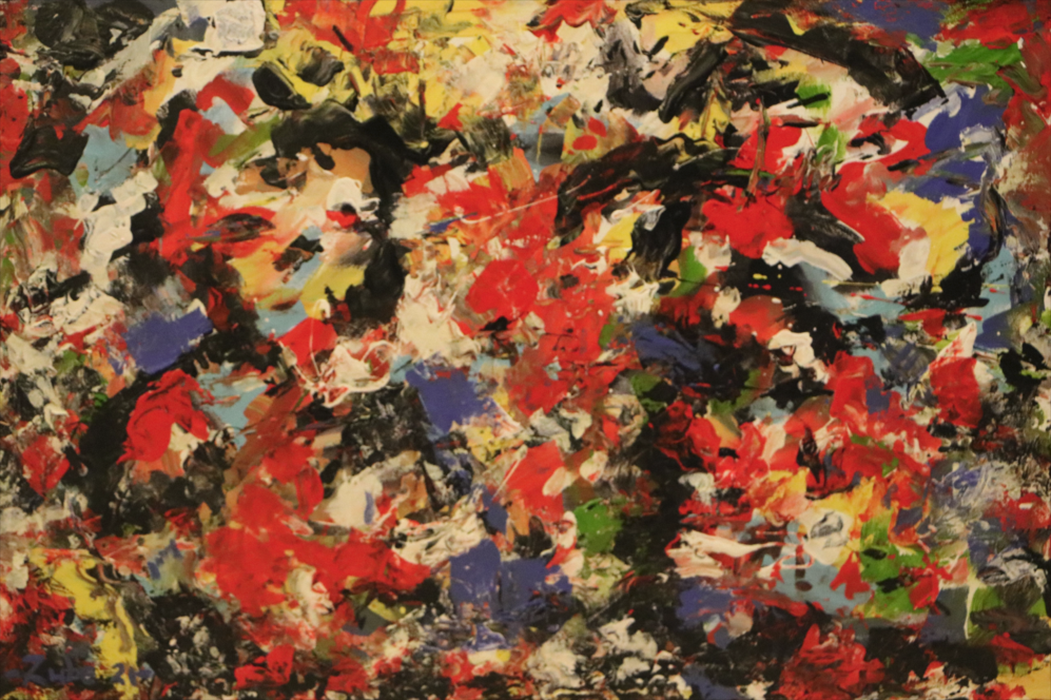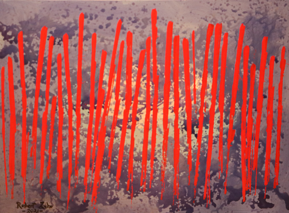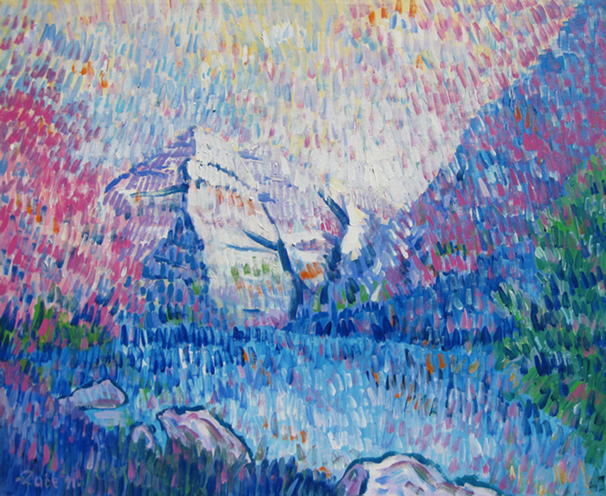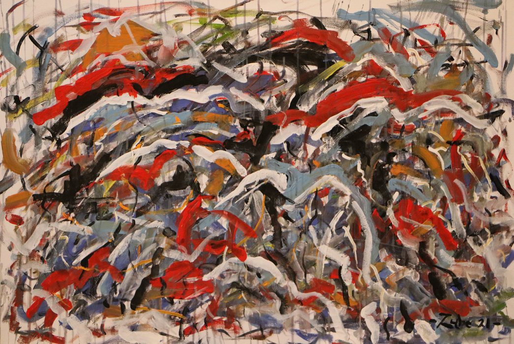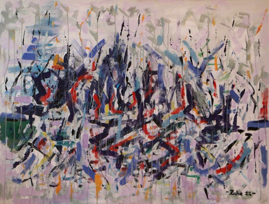 The methodology is not revealed by the linear fragmented lines of the composition. The secret lies in the spaces between the lines. It is here where the distinction between positive and negative space is severed, allowing color to flow freely back and forth between all areas of the painting.