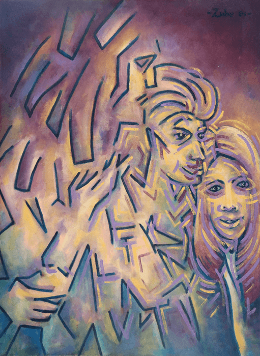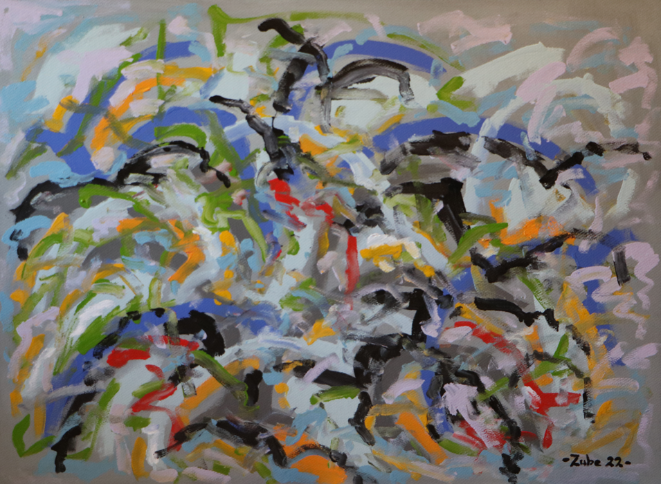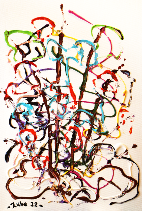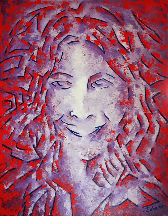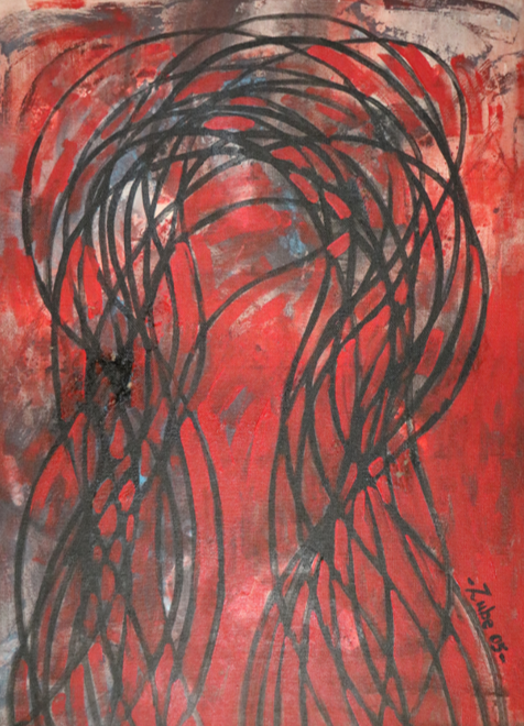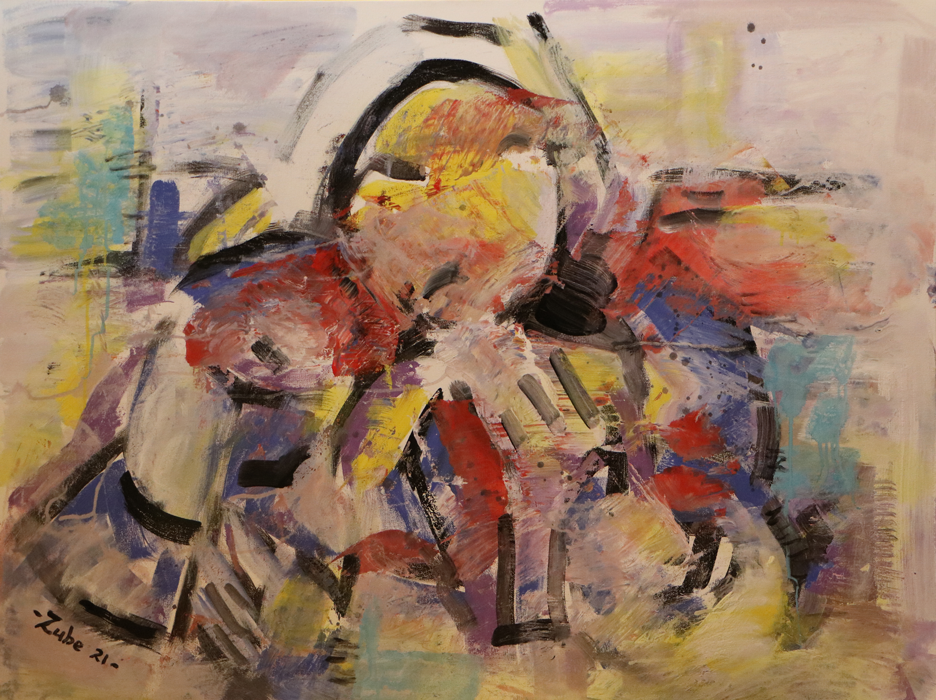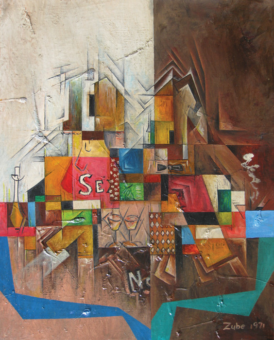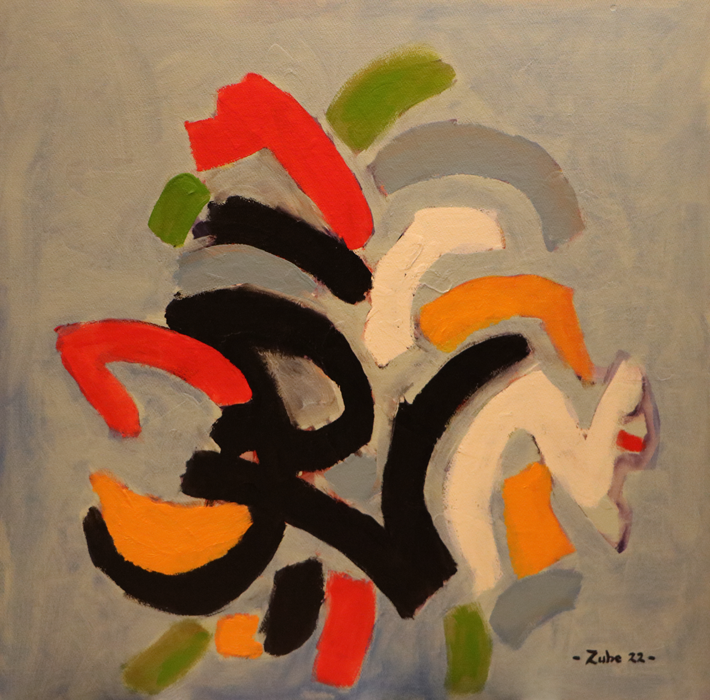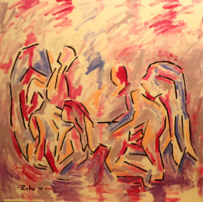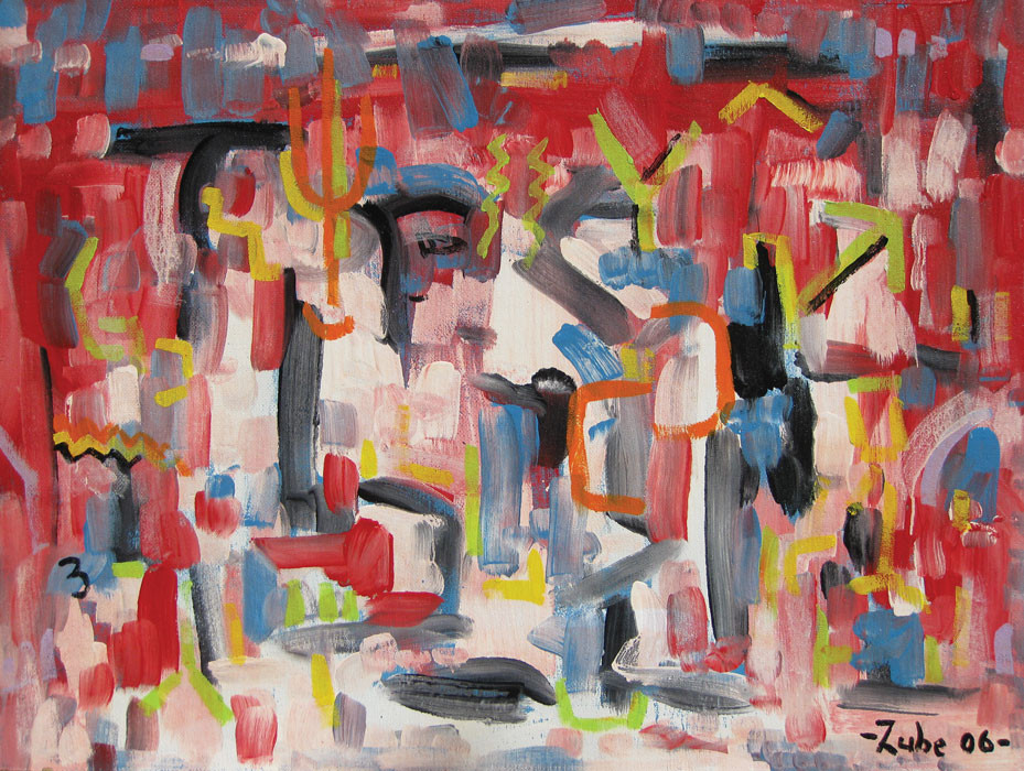 In order to create this painting in the style of the middle Cubist period, one must first compose the subject and then decompose it by erasing half of the sketch in alternating sections. It is in the decomposing that the magic occurs. A new structure is created, and it can then be embellished or moved and repeated.