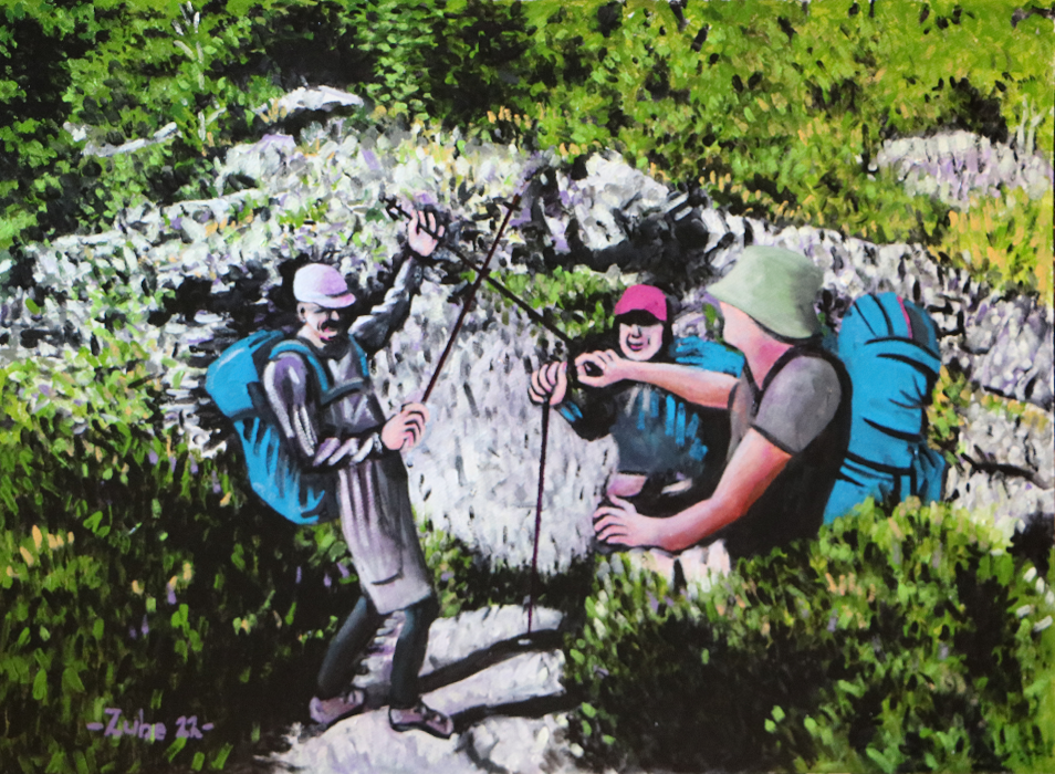 Dueling hiking sticks at Greenstone Gorge on the Grand Traverse, N.Z.